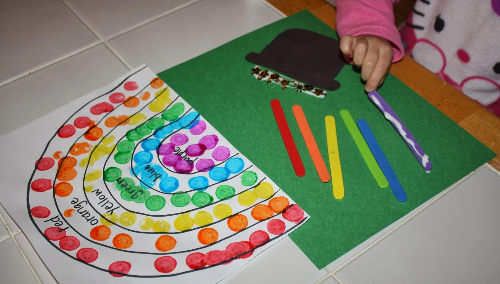 I had some gold bling that I found in a drawer. Students will put glue above the pot and "fill" it with gold. You could also use glitter.We used the rainbow that we already made as an anchor chart. This helped her to put the colors in order.