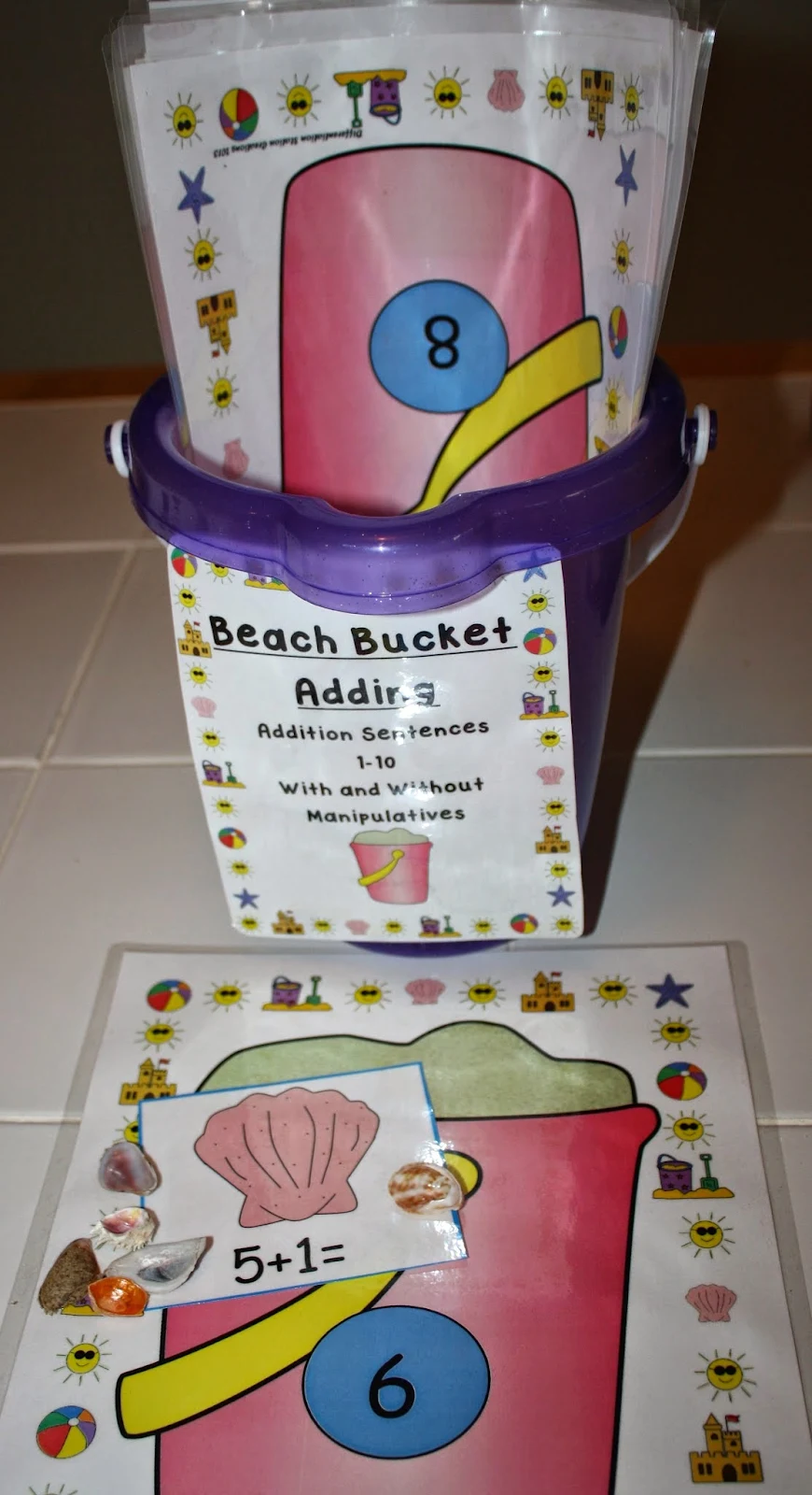 I use the adding machine with my "Fill Up My Bucket!" packet. There are different counting and adding activities in this pack and shells work perfectly. Here is one of the addition centers. Students choose a card and recreate the equation with the shell manipulatives.