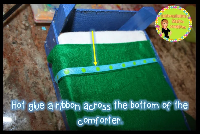 Fold the felt or foam over to create the look of a comforter. Hot glue the felt or foam back on to itself.This is not a necessary step, but you can hot glue ribbon across the top and bottom of the comforter. This is just to add the cute factor.