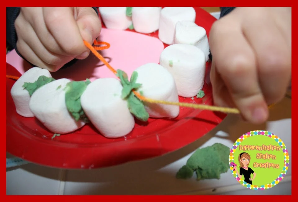 Use stale marshmallows and red plates to create a model of a mouth. Kids can use this model to practice flossing their teeth.  It's really easy to make and your kids are sure to love it!